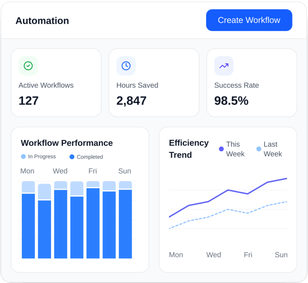 Intelligent automation that learns and adapts. Reduce manual work by up to 80% while improving accuracy and freeing your team for high-value tasks.